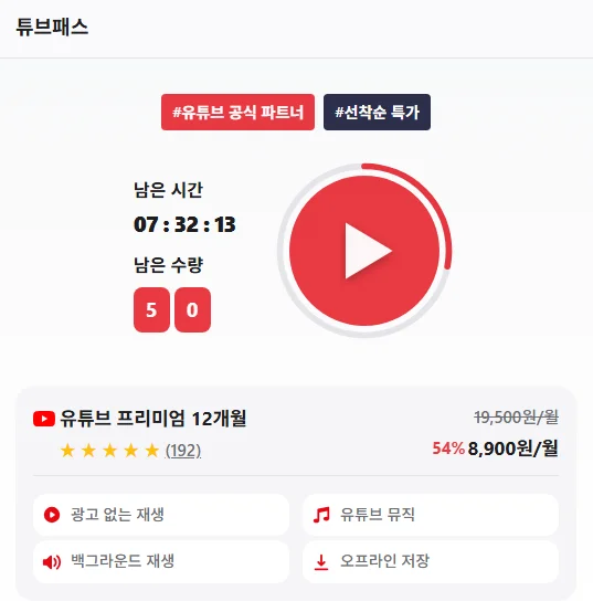 튜브패스는 다수와 함께 공동구매를하여 선착순 특가로 할인돼요!